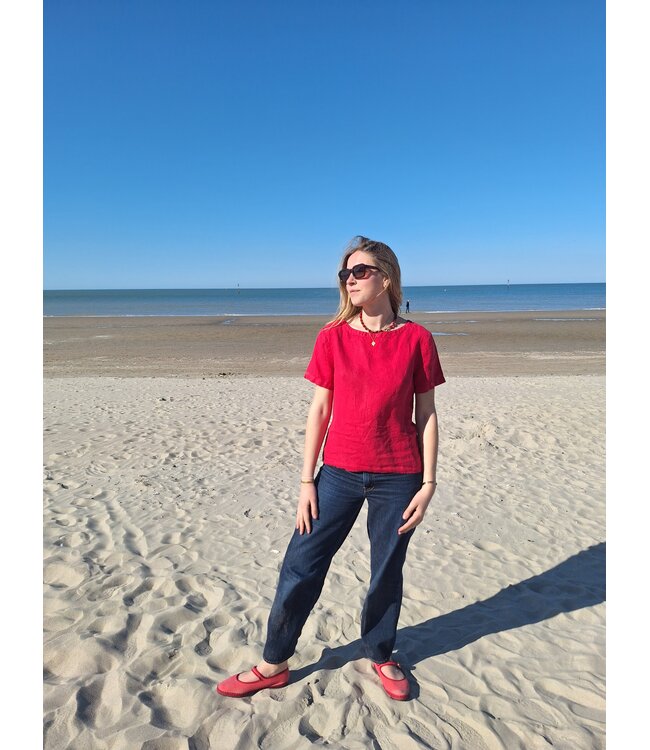 Raspberry-coloured pure linen top with short sleeves